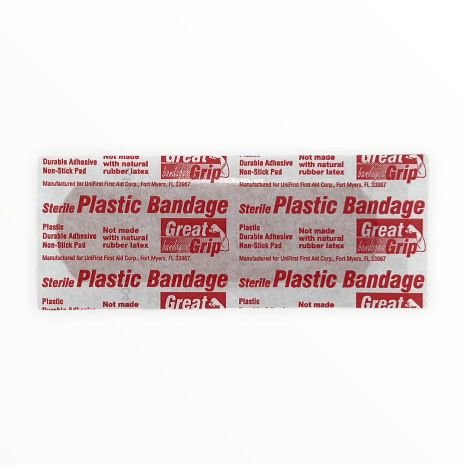 Latex-free plastic adhesive bandages with a non-stick pad and ventilation promote healing.
