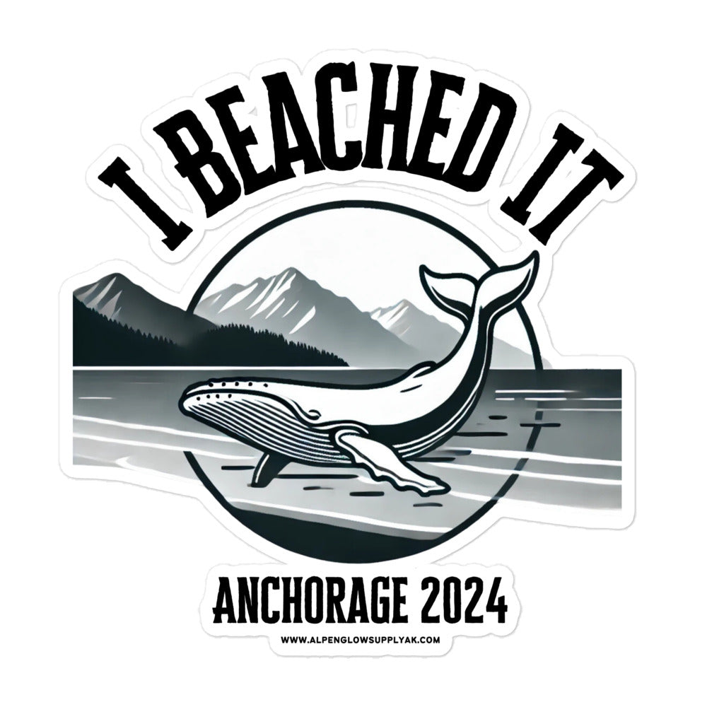 Inspired by the infamous whale that made a splash in Anchorage headlines after beaching at Westchester Lagoon in winter 2024. While the design may not feature the fin whale, this sticker is all about embracing the novelty and humor of the moment. 🐳