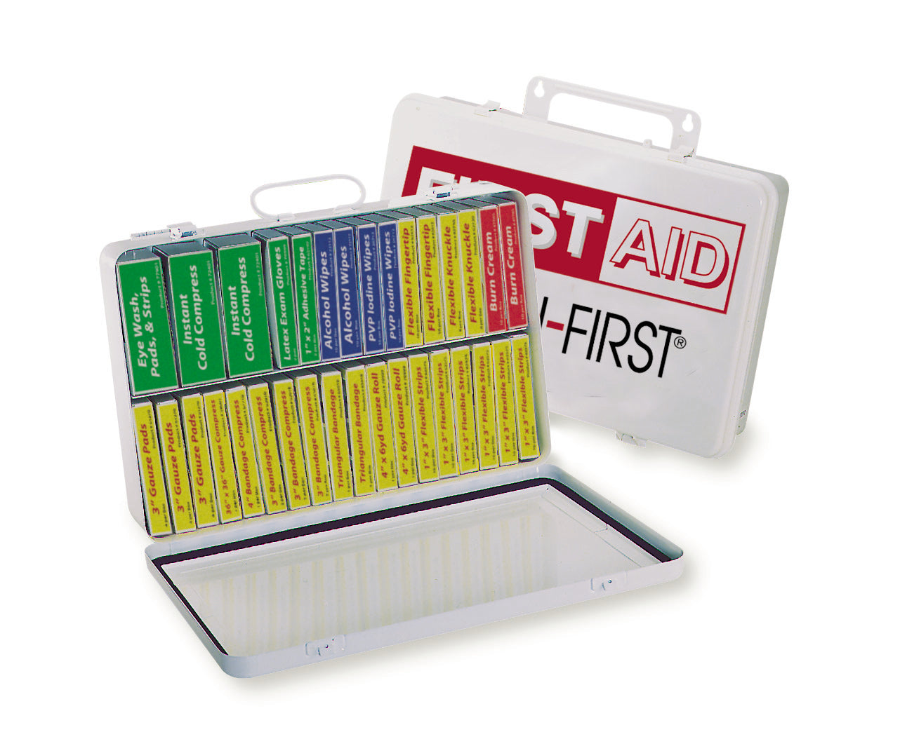 Safety comes first! That’s why you need the 36 UNIT KIT - FILLED METAL KIT, this kit designed to protect you and your team. This kit is filled to the brim with color-coded and clearly marked units that ensure safety while on the job. The easy-to-identify items include Medi-Wash eyewash, antiseptic towelettes, alcohol prep pads, triple antibiotic ointment, ammonia wipes, burn gel, Safetec burn gel, 1-inch X 3-inch plastic bandage strips, 3-inch X 3-inch sterile gauze pads, eye pads, fingertip woven bandages, woven knuckle bandages, triangular bandage with pins, 1/2-inch X 2.5-yard adhesive tape and 4-inch compress as well as more for any potential medical emergencies. Plus, it even includes a first aid handbook for just in case! Best of all? It comes in handy metal case for easy and safe storage. Don't wait until it's too late - invest in the 36UNIT KIT - FILLED METAL today!