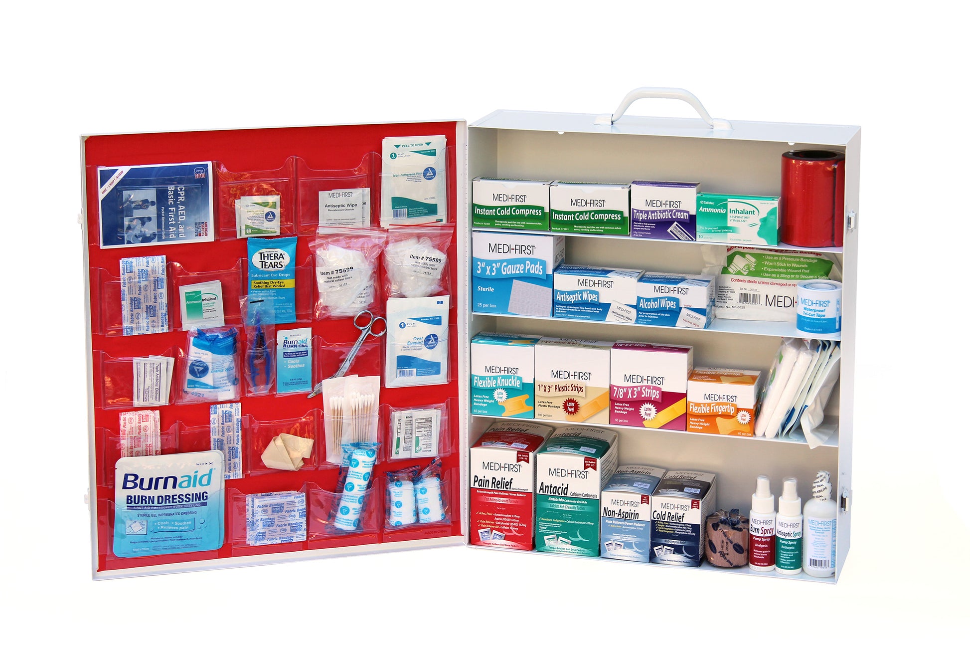 More space for the items you need. Extra large cabinet contains a wide assortment of first aid supplies, employee comfort items, burn relief and other emergency supplies. Convenient door pouches allow for storage and easy access of smaller items. Easy to use side door opening cabinet can be wall mounted. Perfect for large industrial work settings. Fill meets ANSI Z308.1-2015.
