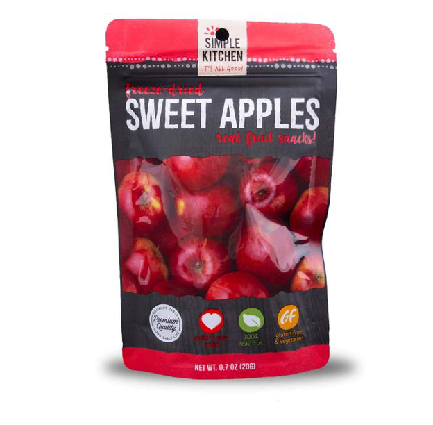 This box includes six pouches of Simple Kitchen's (a Wise Company brand) 4 serving freeze-dried sweet apples. No fake flavors or preservatives.