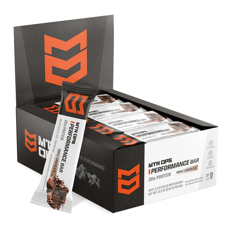 MTN OPS Performance Bars are built to Conquer More, featuring 10 Bars per box with 20 grams of blended protein including whey isolate, whey concentrate, and collagen per bar. 4 grams or less in added sugar and top-notch flavor, our bars are gluten-free and adventure-ready.