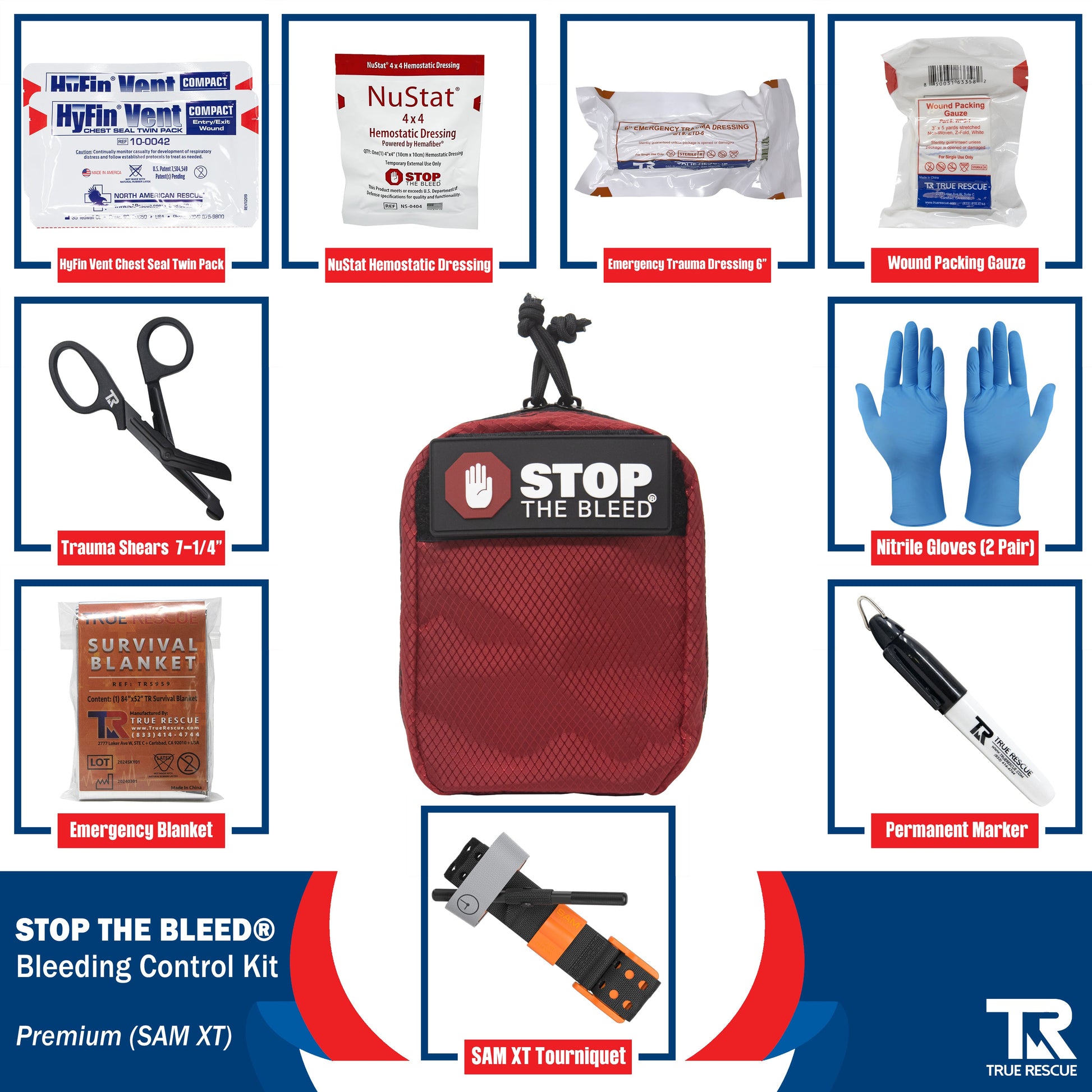 | Premium Kit - The Premium Kit includes all contents from the Standard & Intermediate Kits, with the final addition of either QuikClot Bleeding Control Dressing or NuStat 4x4 Hemostatic Gauze. This hemostatic dressing contains hemostatic agents which accelerate the body’s natural blood-clotting abilities. This allows for faster bleeding control than traditional gauze. |