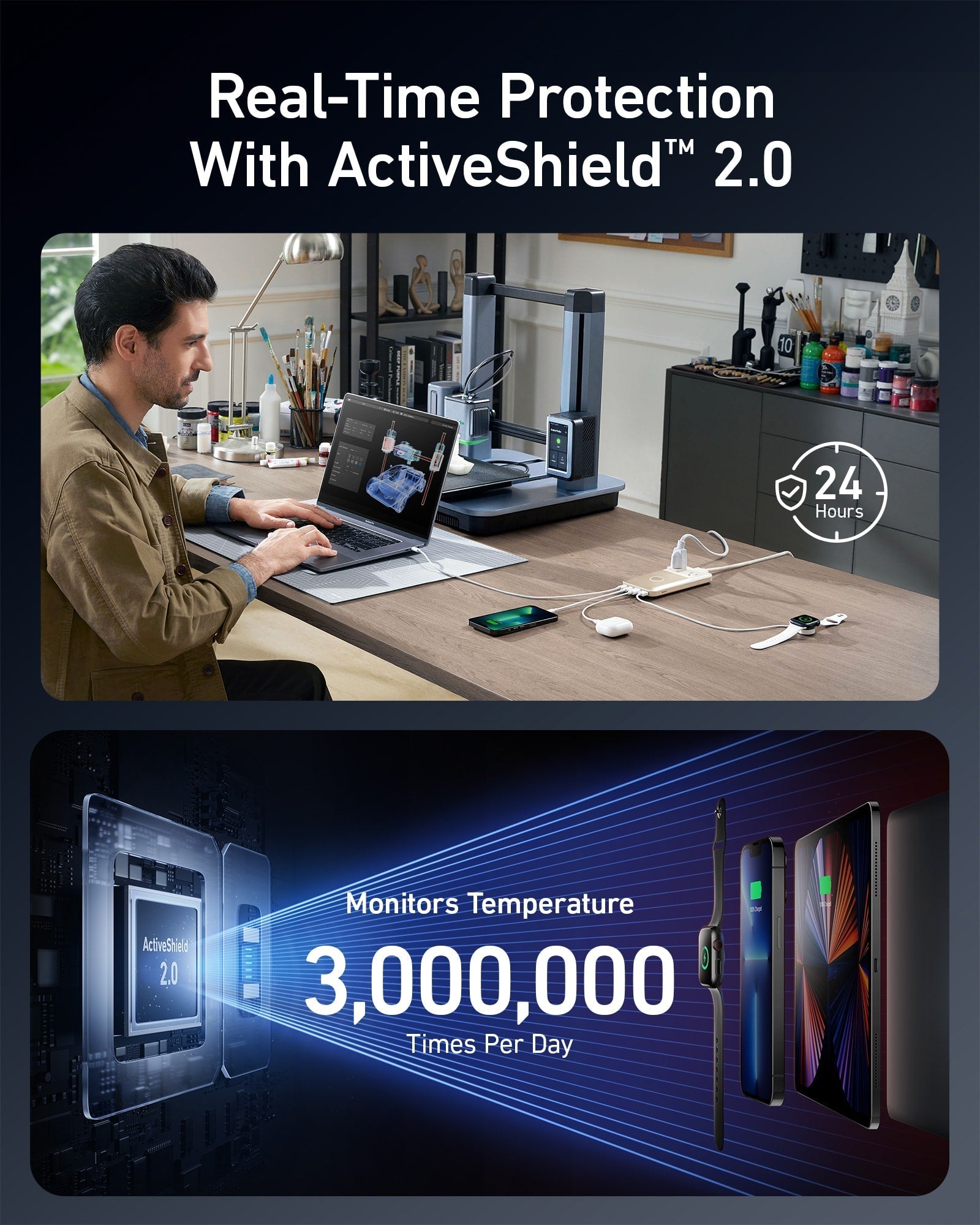 - ActiveShield™ 2.0: Anker's proprietary technology enhances protection by intelligently monitoring temperature and adjusting power output to safeguard your connected devices.