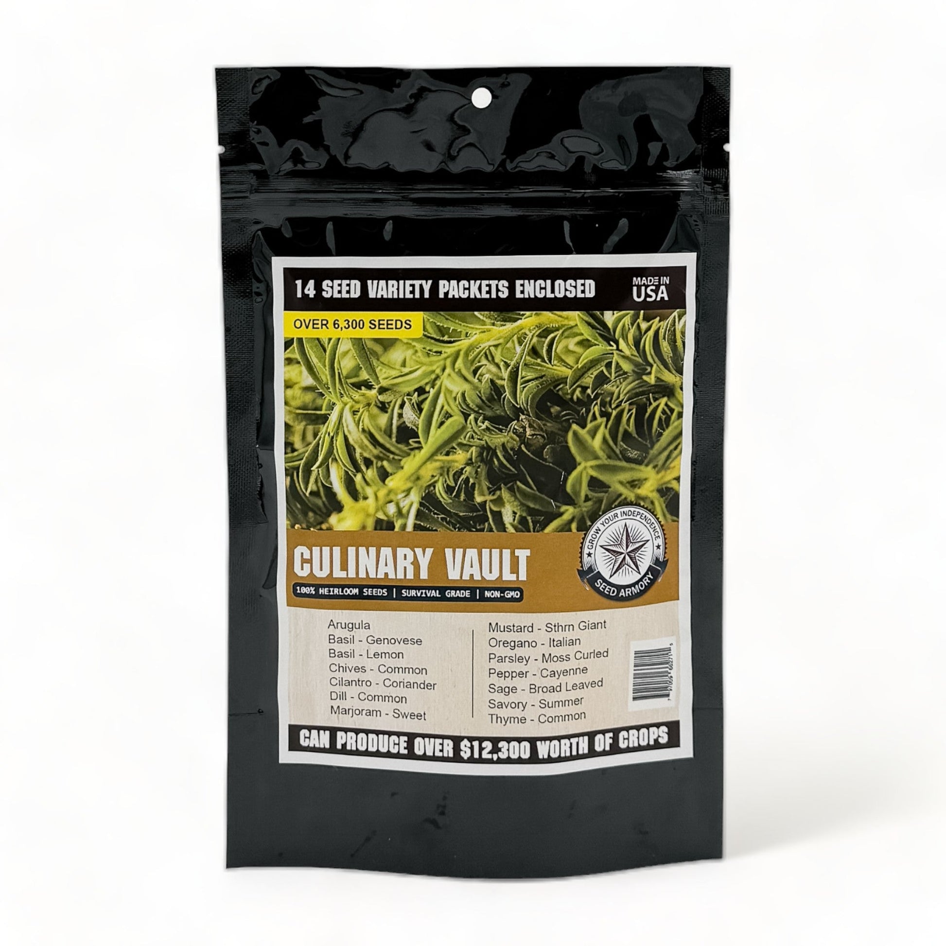 The Culinary Seed Vault is where you'll find your common kitchen herbs and spices. Every herb in this vault is germination tested for quality and freshness. Each variety is packaged in its own resealable mylar packet, and tucked inside a resealable mylar parent bag for further protection.