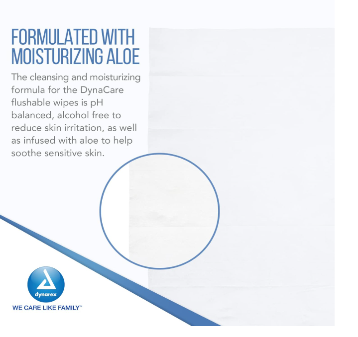 Dynarex Flushable Wipes are convenient, pre-moistened cloths designed to cleanse skin without the need for rinsing. These disposable, alcohol-free wipes are pH-balanced and formulated with aloe to help soothe and moisturize skin.
