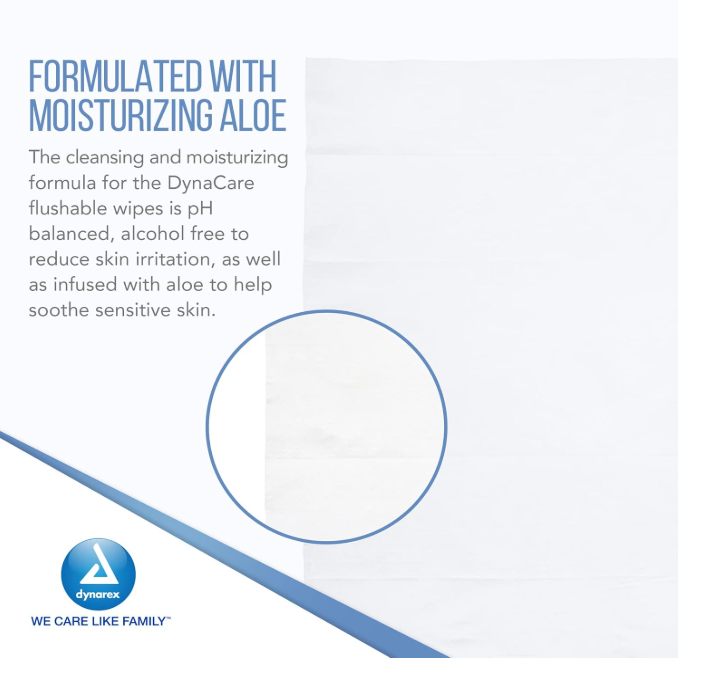 Dynarex Flushable Wipes are convenient, pre-moistened cloths designed to cleanse skin without the need for rinsing. These disposable, alcohol-free wipes are pH-balanced and formulated with aloe to help soothe and moisturize skin.