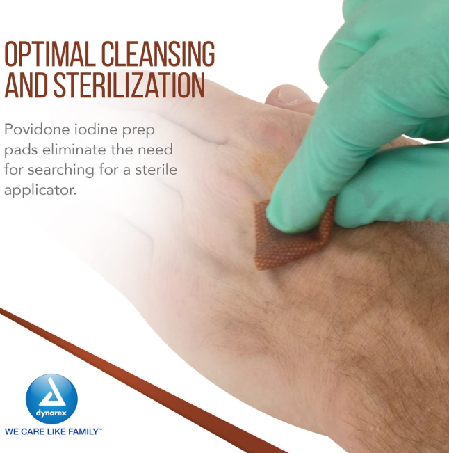 Dynarex Povidone Iodine Prep Pads are premium antiseptic pads saturated with 10% povidone iodine solution to help control bacteria and minimize the risk of infection. These Prep Pads are designed for effective cleansing and preparation of skin for medical procedures. Povidone Prep Pads are individually packaged in convenient, easy-to-tear pouches. Ideal for use with a variety of procedures, including venipuncture, IV starts, renal dialysis, and pre-op prepping.