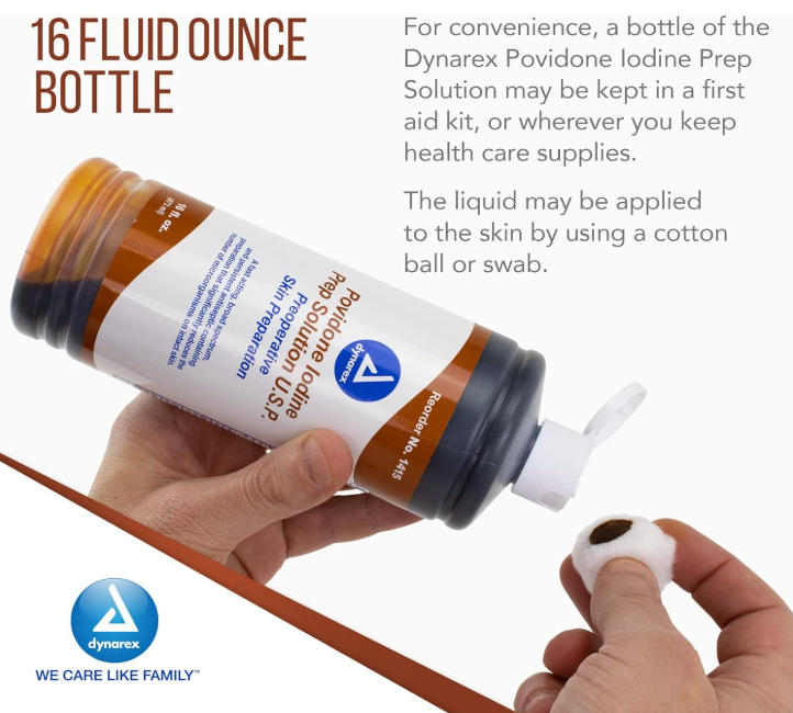 Dynarex Povidone Iodine Prep Solution is a high-quality antiseptic solution designed to effectively prepare skin for medical procedures and to help reduce the risk of infection in minor wounds.