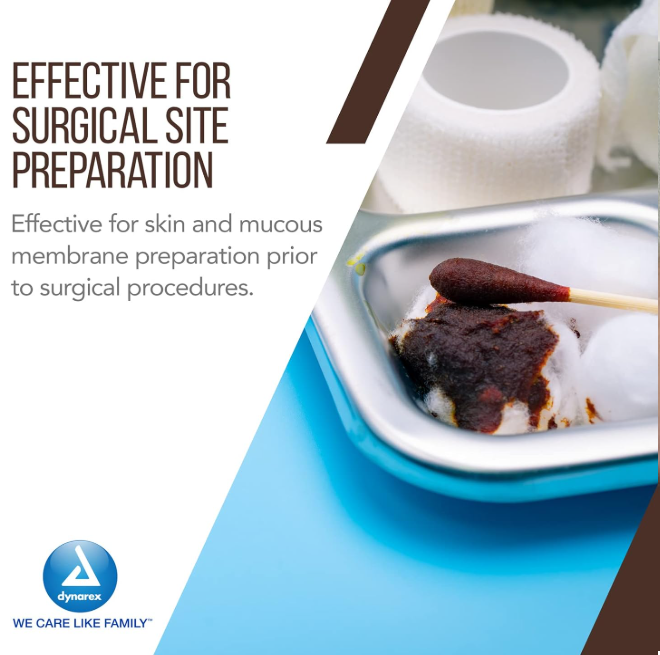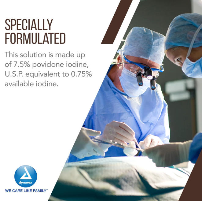 Dynarex Povidone Iodine Scrub Solution is a high-quality antiseptic solution designed to effectively cleanse and prepare skin for medical procedures and to help minimize the risk of infection in minor wounds.