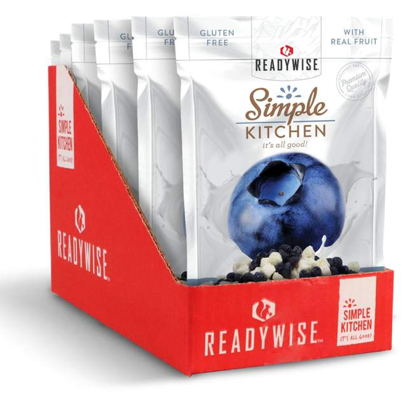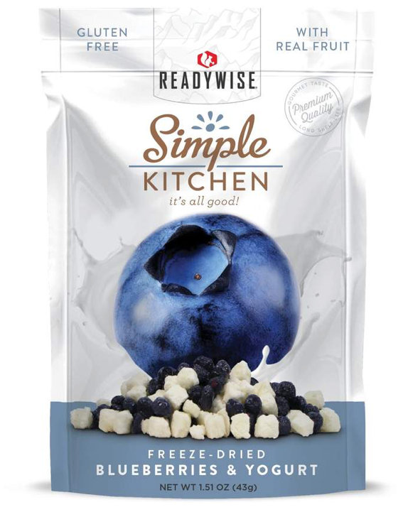This box includes six pouches of Simple Kitchen's (a Wise Company brand) 4 serving freeze-dried blueberries & yogurt. No fake flavors or preservatives.