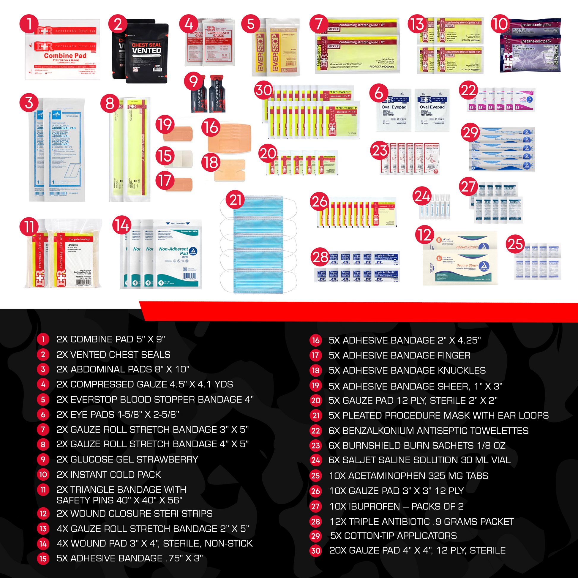 Tactical Trauma Kit: Includes essential emergency items such as a CAT tourniquet, chest seals, LifeStraw water filter, and clotting gauze for quick and effective treatment in critical situations.