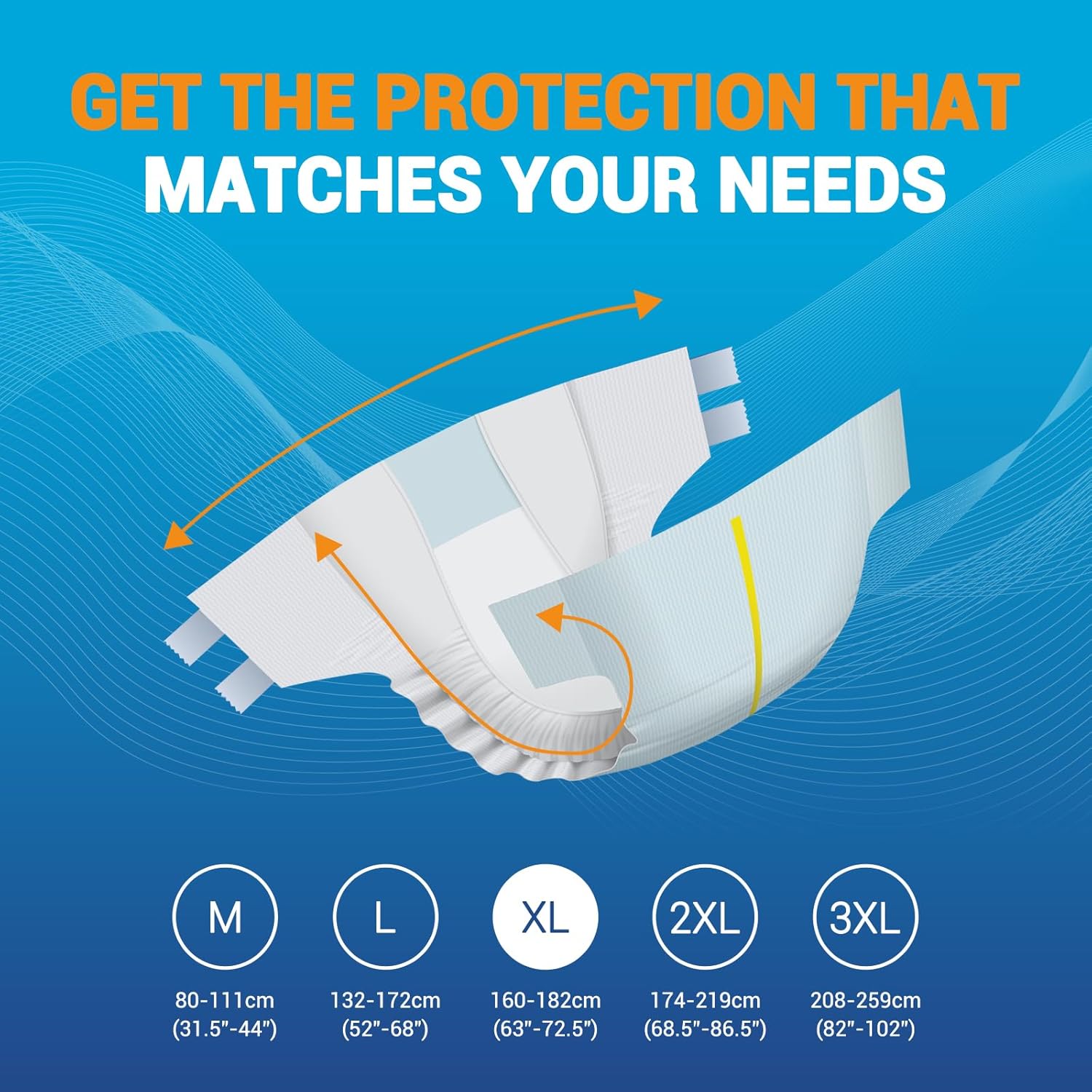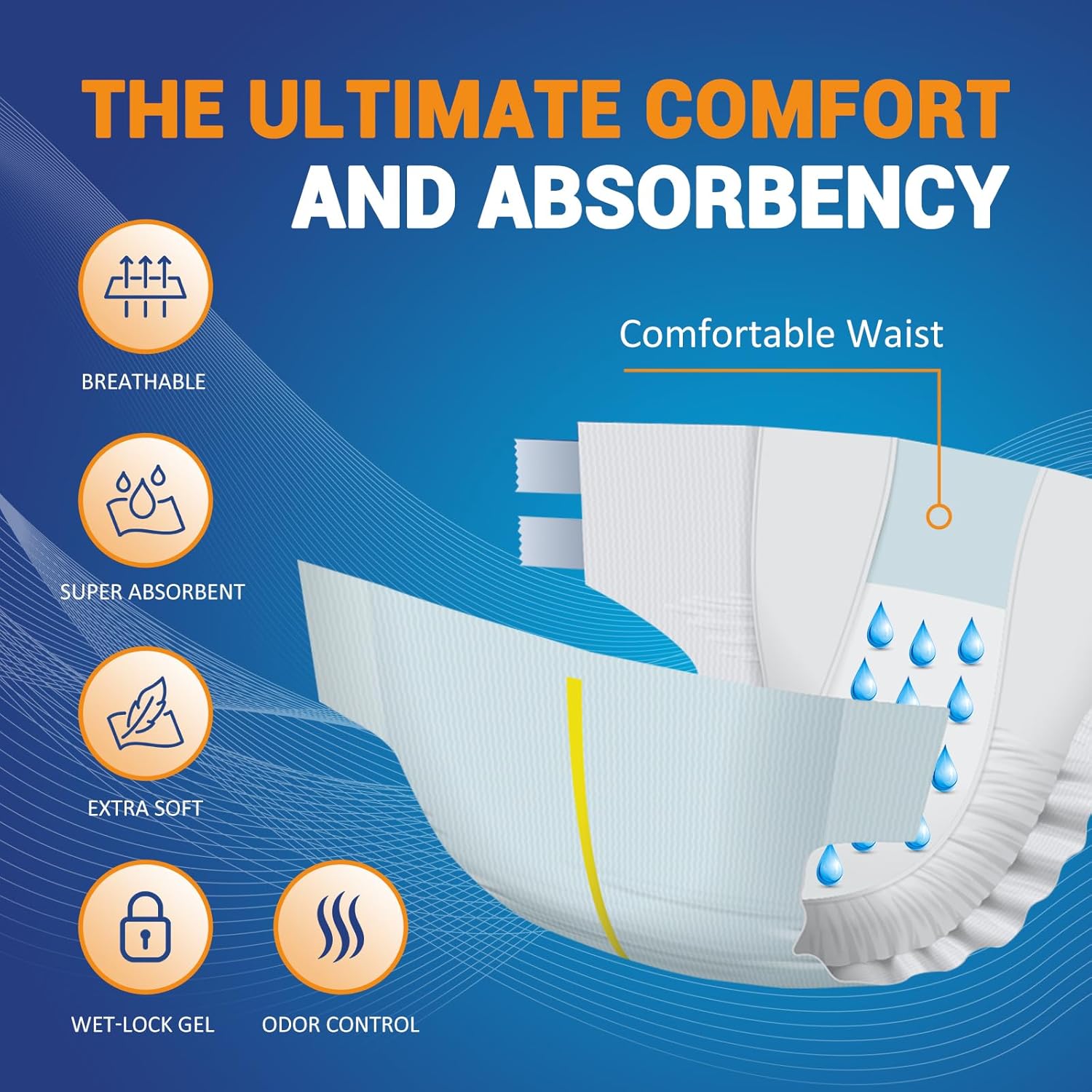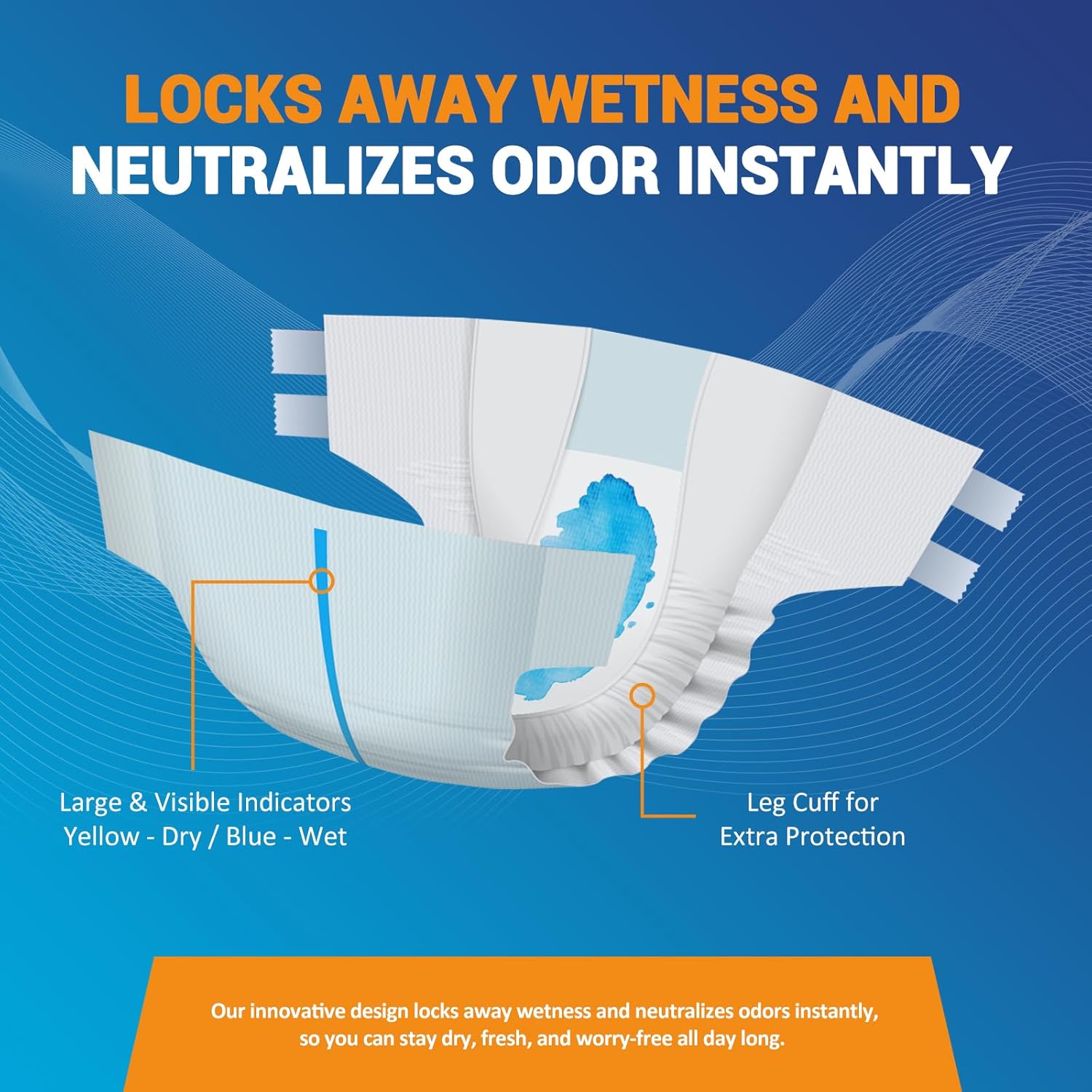 The skin-friendly closures are not only secure but also adjustable, allowing for repeated repositioning and refastening to achieve a snug fit. Plus, with two generously lined wetness indicators, users are promptly notified of the need for a change as the color transitions from yellow to blue upon wetness.