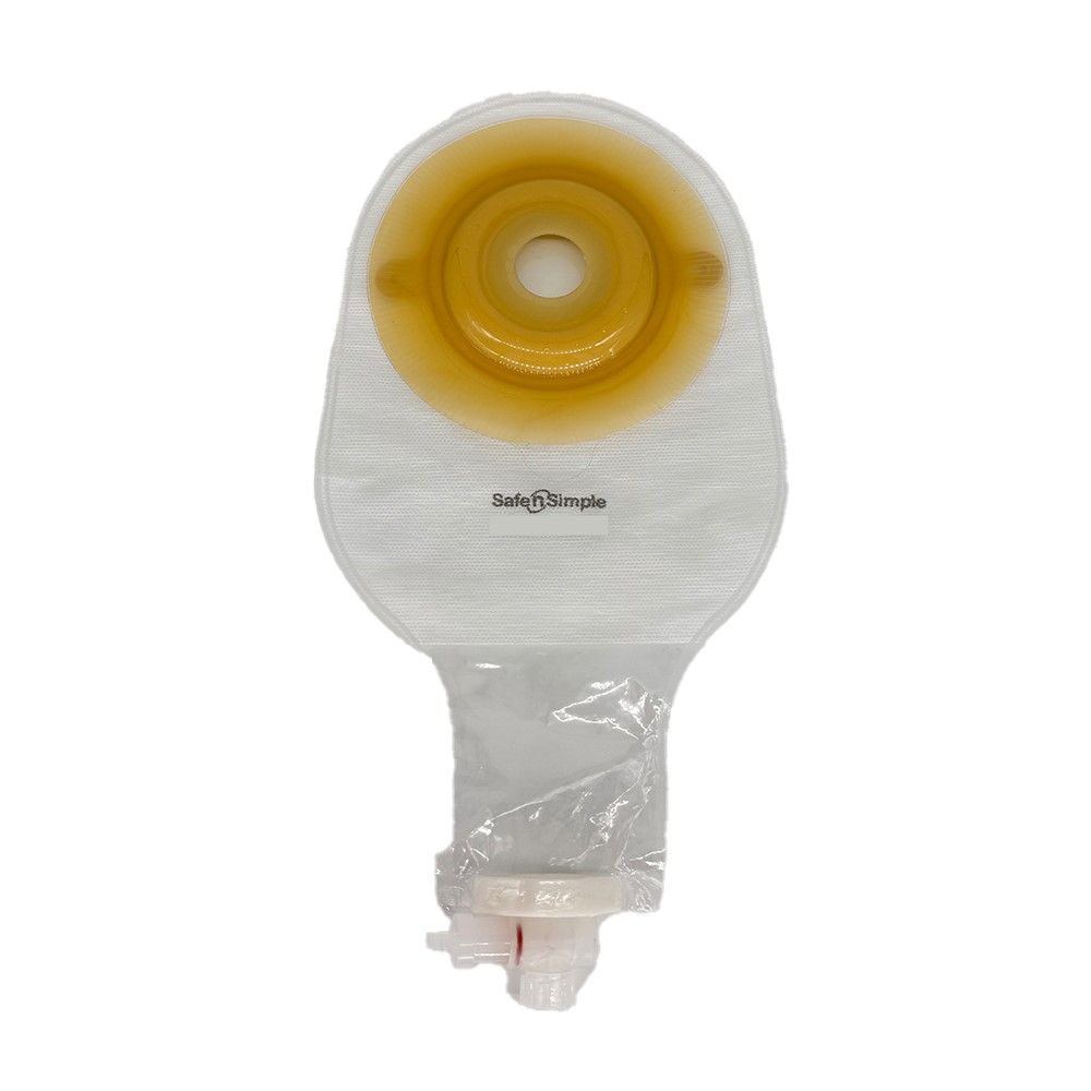The Safe n Simple 1-Piece is a urostomy pouch with integrated belt tabs that help secure it to an ostomy belt (sold separately). The pouch is transparent for easy visual inspection of its contents.