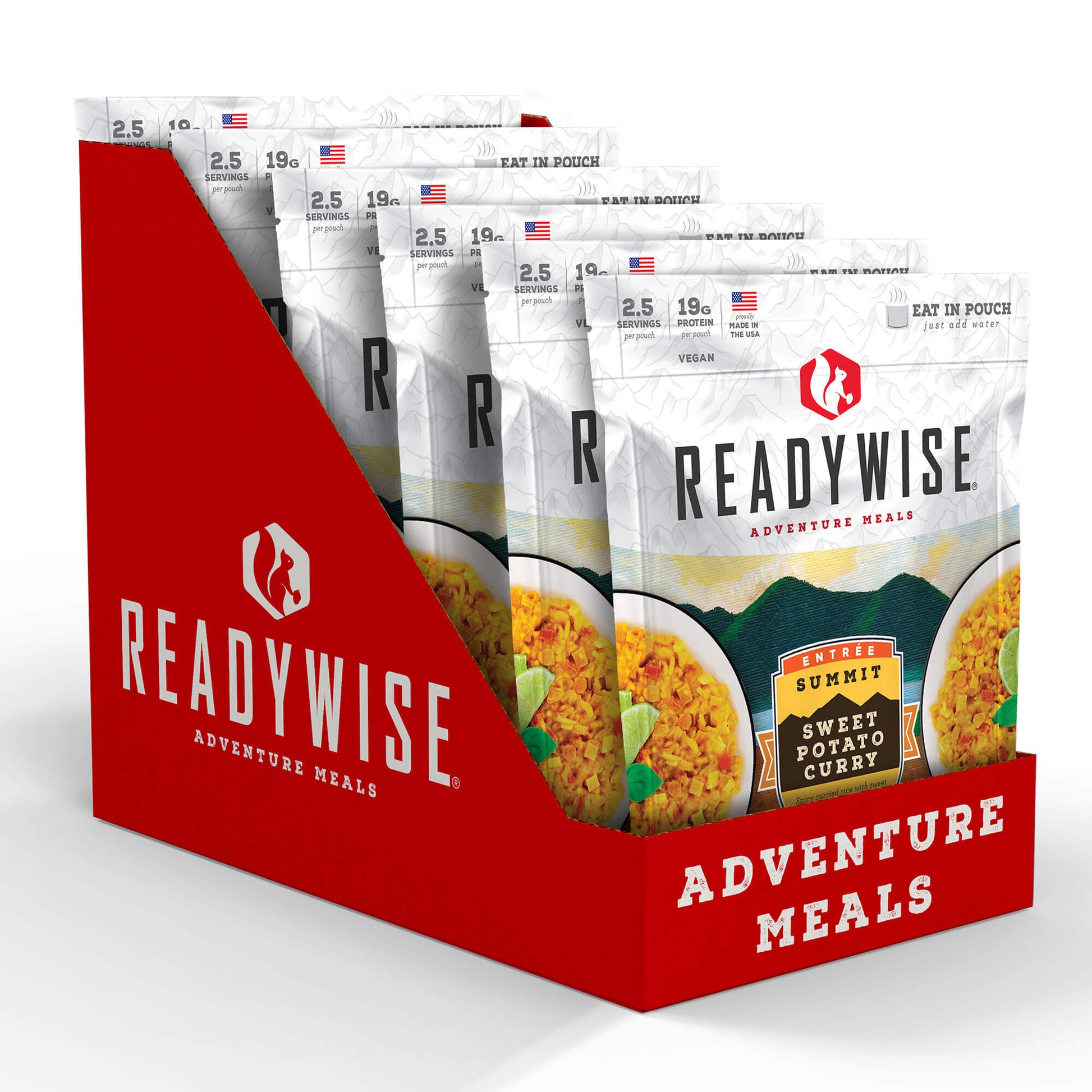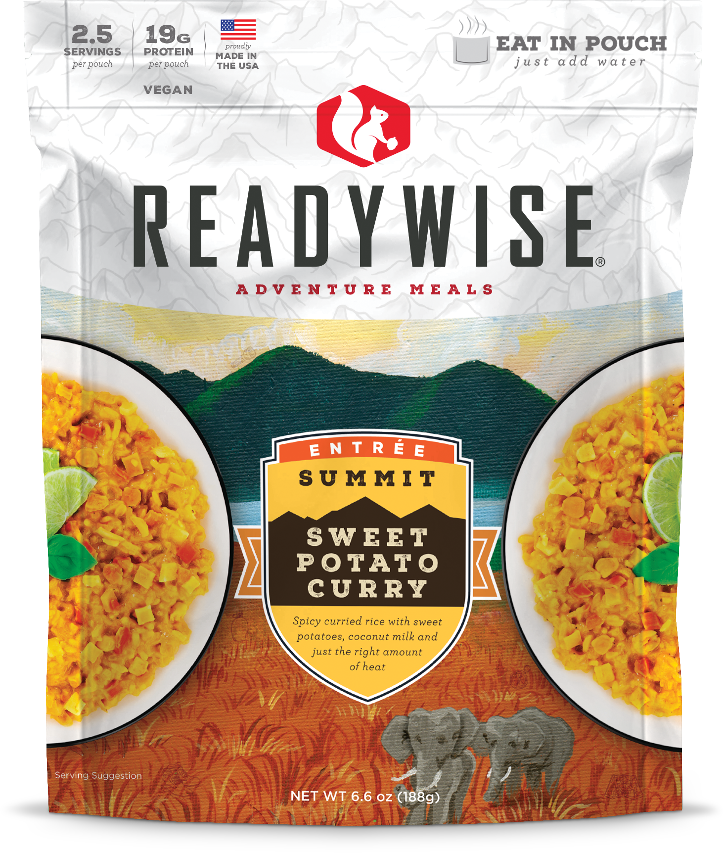 Each pouch of our Summit Sweet Potato Curry contains 2.5 servings and is resealable. These pouches are lightweight making them easily portable on any outdoor adventure. Just add water and you can eat directly from the pouch.